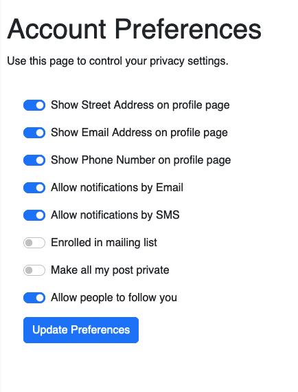 Be sure to set your preferences, this will control things like showing your email address, street address and phone number on the website. You can also set whether you want to receive email or sms text notifications from the site. You can find these setting on your profile page.