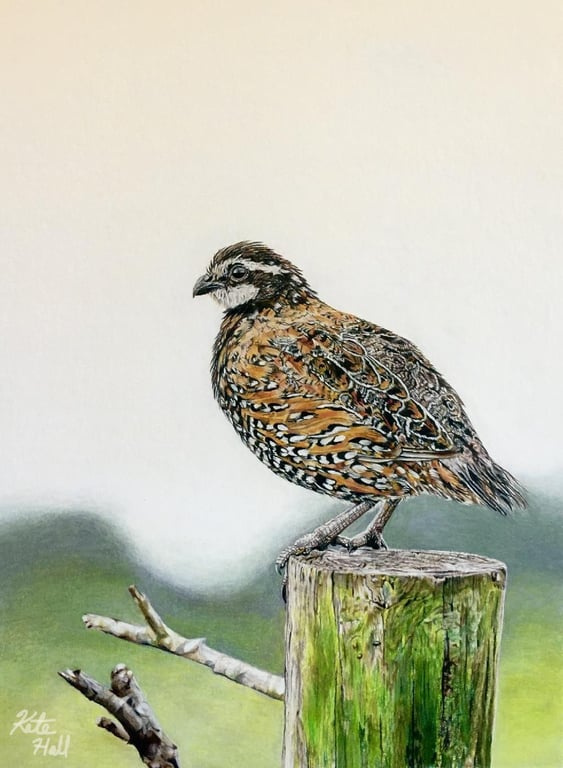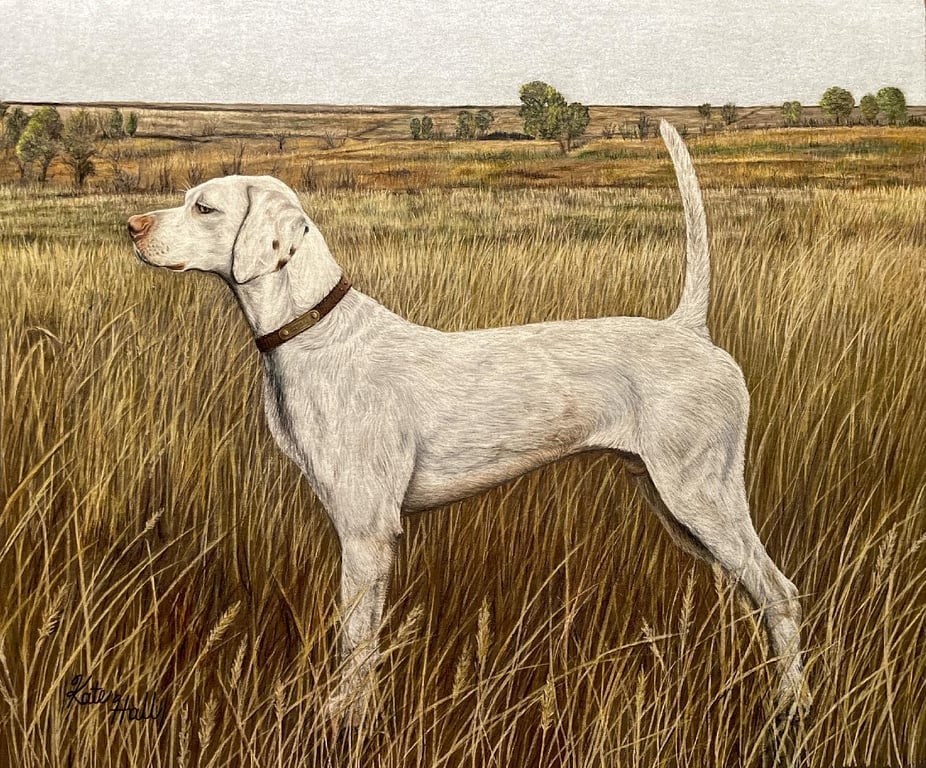 About Kate : Kate Hall is an outdoor artist who resides on an Angus cattle farm in Tennessee, where she began hunting at an early age. During her 13 years as a flight attendant, Kate visited 27 countries and all 50 states. She now spends her time traveling across the country in search of rising trout and upland birds with her husband and their English Setter. In his first two seasons they hunted on public lands in MT, KS, SC, AL, NC, KY and TN for quail, ruffed grouse, sharptail grouse, woodcock, pheasant, prairie chickens, and hungarian partridge. Upland hunting has enriched Kate's life and influences much of her colored pencil work.