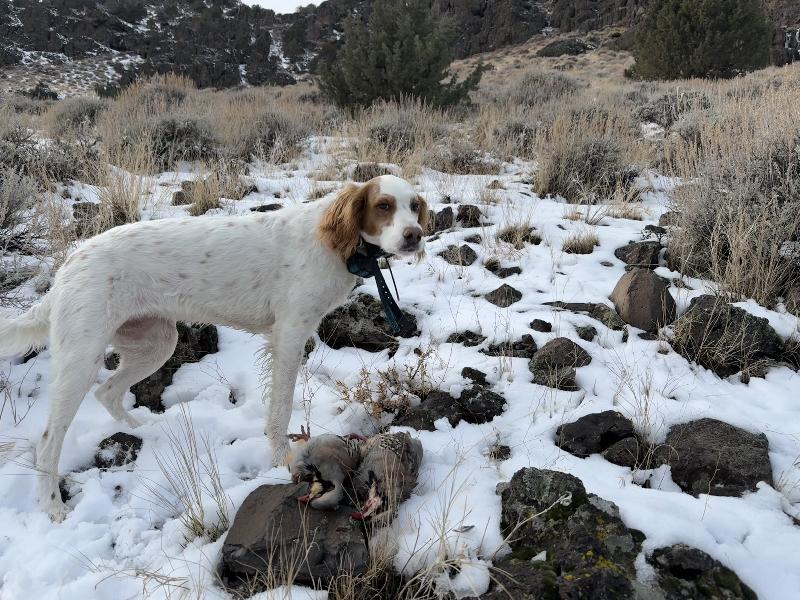 Wheels is closing in on 10 years old. Went out to the steep cliff country where she got her start as a chukar dog for the first time in several years yesterday. She didn’t run as fast or cover as much country as she used to, didn’t need to. She ran straight to the right places and pinned a huge covey of chukar. The youngster I put down with her popped up on the other side of the covey and blocked them from running along the cliff. They were about 800’ vertical above me and it took me several minutes to get there but the girls still had them. Got a double on the covey rise, took a quick photo of the the star of the show (much to her chagrin) and worked our way back down the hill. Tough, steep country and one heck of a death march up the hill, but what a memory! Gotta love those old dogs that can still get it done ❤️